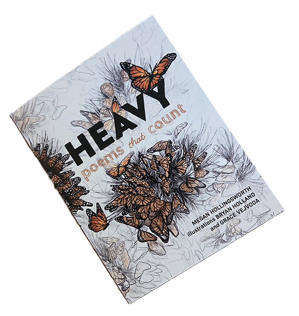 Heavy: Poems that Count (Rockwood Press, April 2026) includes ten narrative witness poems. Illustrations by artist Bryan Holland, based on photos provided by individuals and groups working for peaceful coexistence, compliment seven of the poems. Cover illustration of a monarch congregation by designer Grace Vejvoda is from a photo provided by conservation biologist Isis Howard, Xerces Society.