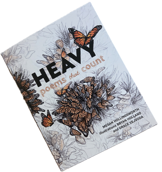 Heavy: Poems that Count (Rockwood Press, April 2026) includes ten narrative witness poems, mostly revisions of those from the original online Extinction Witness offerings, that include numbers and/or refer to counting and water. Illustrations by artist Bryan Holland, based on photos provided by individuals and groups working for peaceful coexistence, compliment seven of the poems. The cover illustration of a monarch congregation by designer Grace Vejvoda is from a photo provided by conservation biologist Isis Howard, Xerces Society.